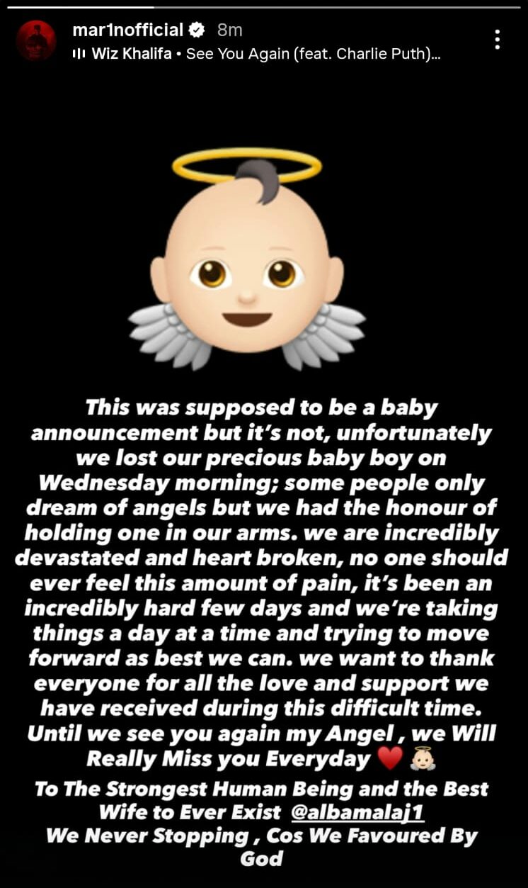 ”Kjo duhej të ishte një lajm i bukur shtatzënie, por fatkeqësisht nuk është. Të mërkurën në mëngjes humbëm djalin tonë të vogël. Disa njerëz vetëm ëndërrojnë engjëj, por ne patëm nderin të mbajmë një të tillë në krahët tanë. Jemi të shkatërruar dhe zemërthyer, askush nuk duhet të ndjejë këtë dhimbje. Këto ditë kanë qenë jashtëzakonisht të vështira dhe po përpiqemi t’i marrim gjërat ditë pas dite, duke ecur përpara sa më mirë që mundemi”, shkruan reperi. Ai falënderon publikisht të gjithë për mbështetjen dhe dashurinë që ka marrë gjatë kësaj periudhe të vështirë.