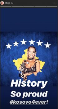Krenare që përfaqëson Kosovën në çdo pjesëmarrje të saj është edhe vet Rita. Këtë e dëshmon edhe fotografia e fundit e saj e postuar në një Instastory, ku artistja shihet me flamurin e shtetit të saj në sfond, teksa ka shkruar: Të bësh historinë, kaq krenare!