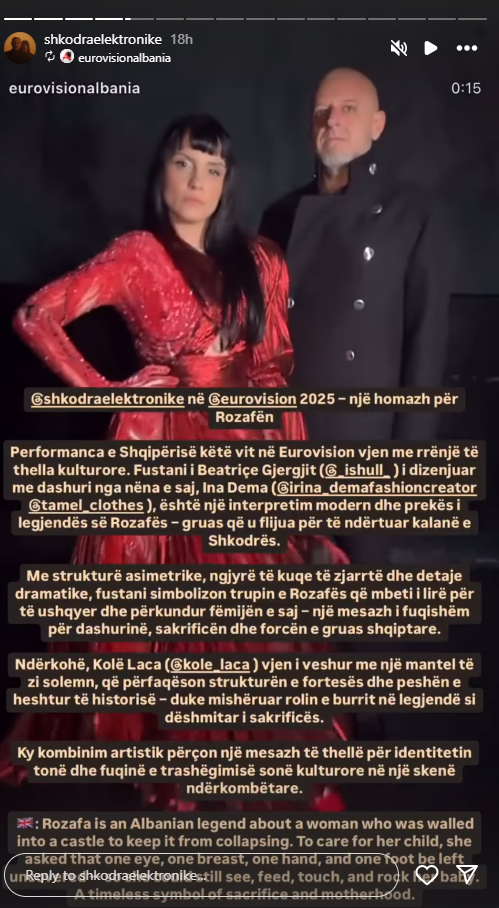 Ky fustan unik përfaqëson një interpretim modern të legjendës së Rozafës, heroinës së mitologjisë shqiptare që u flijua për ndërtimin e Kalasë së Shkodrës. Me një ngjyrë të kuqe të zjarrtë, ai simbolizon trupin e Rozafës që mbeti i lirë për të ushqyer dhe përkundur fëmijën e saj një mesazh i fuqishëm për dashurinë, sakrificën dhe forcën e gruas shqiptare. Ky fakt u bë i ditur nga Eurovision Albania, të cilët theksuan edhe dimensionin emocional që mbart ky detaj.