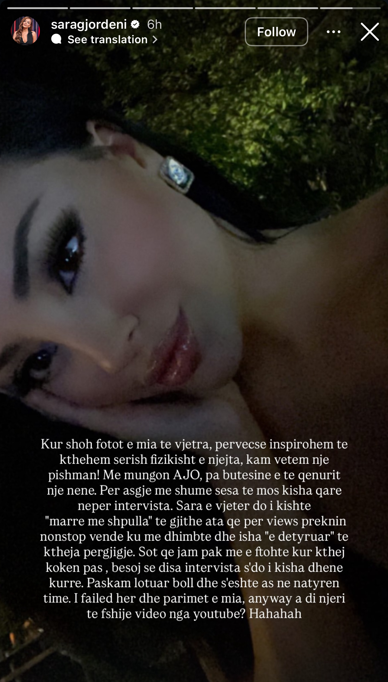 “Besoj se disa intervista s’do i kisha dhënë kurrë. Paskam lotuar boll dhe s’është as në natyrën time. I failed her dhe parimet e mia,” shton Gjordeni, duke e mbyllur rrëfimin me humor të lehtë: “Anyway a di njeri të fshijë video nga YouTube? Hahahah”.