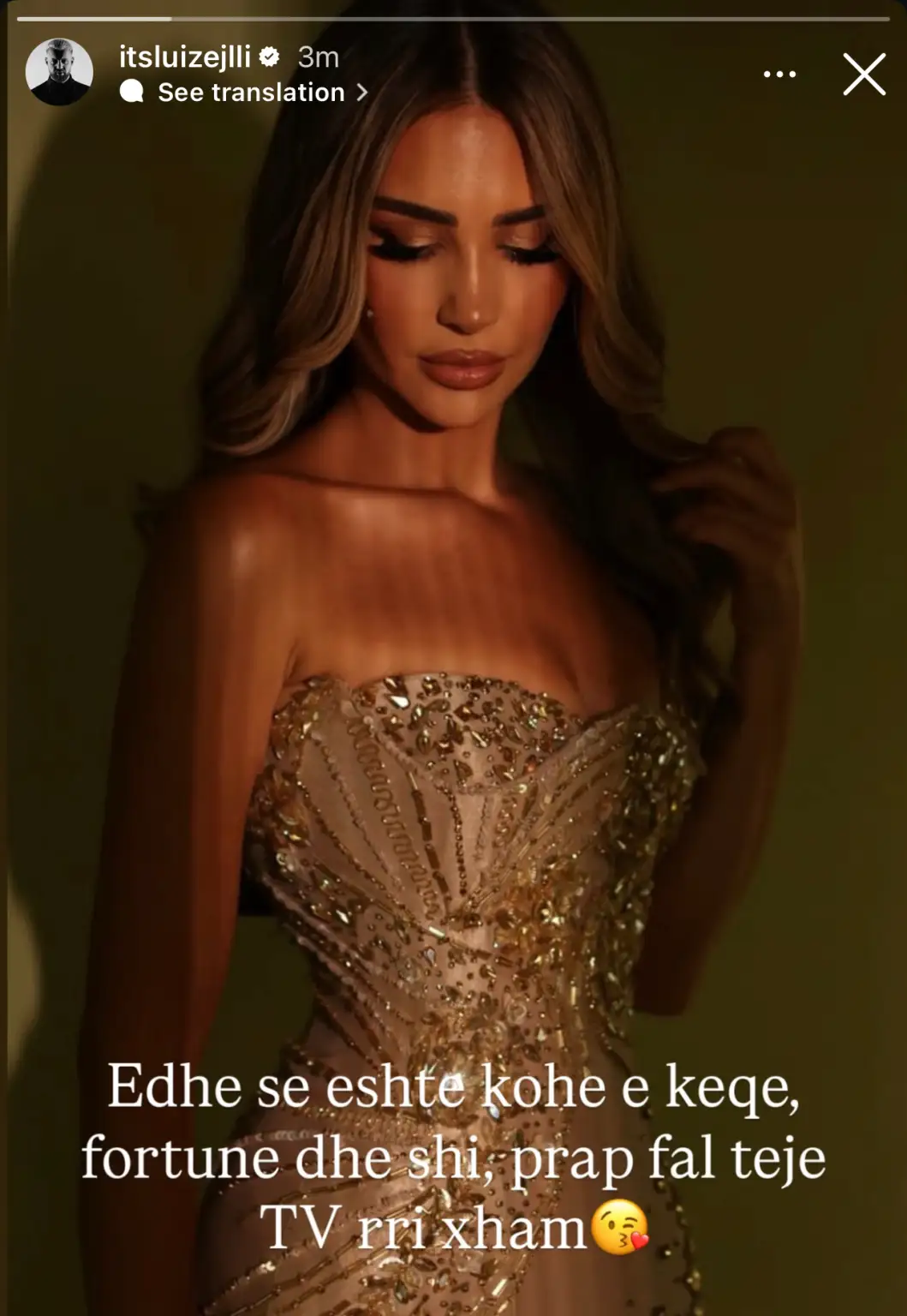 Luiz Ejlli ka ndarë një postim që ka tërhequr menjëherë vëmendjen e ndjekësve në rrjete sociale. Në Instastory, këngëtari ka publikuar një foto të bashkëshortes së tij, Kiarës, e cila shfaqet mahnitëse me një fustan elegant ngjyrë ari, të stolisur me detaje vezulluese që nxjerrin në pah hijeshinë dhe bukurinë e saj.