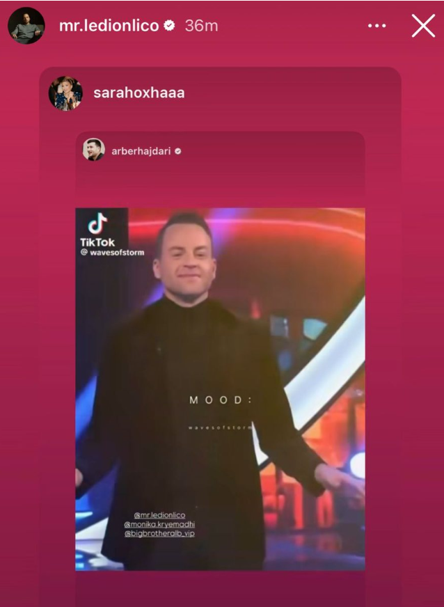 Një video e publikuar nga Arbër Hajdari, ku shfaqen Ledion Liço, Monika Kryemadhi dhe vetë ai duke kërcyer në studio, në një atmosferë të relaksuar, mund të duket si një postim i zakonshëm gjatë “Big Brother VIP”. Në momentin që në video bëhet tag edhe Sara Hoxha, e cila më pas e riposton në Instagram, dhe më pas e riposton edhe Ledioni, historia nis të marrë një tjetër ngjyrim.