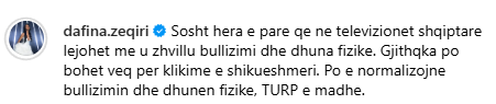 ”Nuk është hera e parë që në televizionet shqiptare lejohet të zhvillohet bullizimi dhe dhuna fizike. Gjithçka po bëhet vetëm për klikime dhe shikueshmëri. Po e normalizojnë bullizimin dhe dhunën fizike. TURP i madh”.