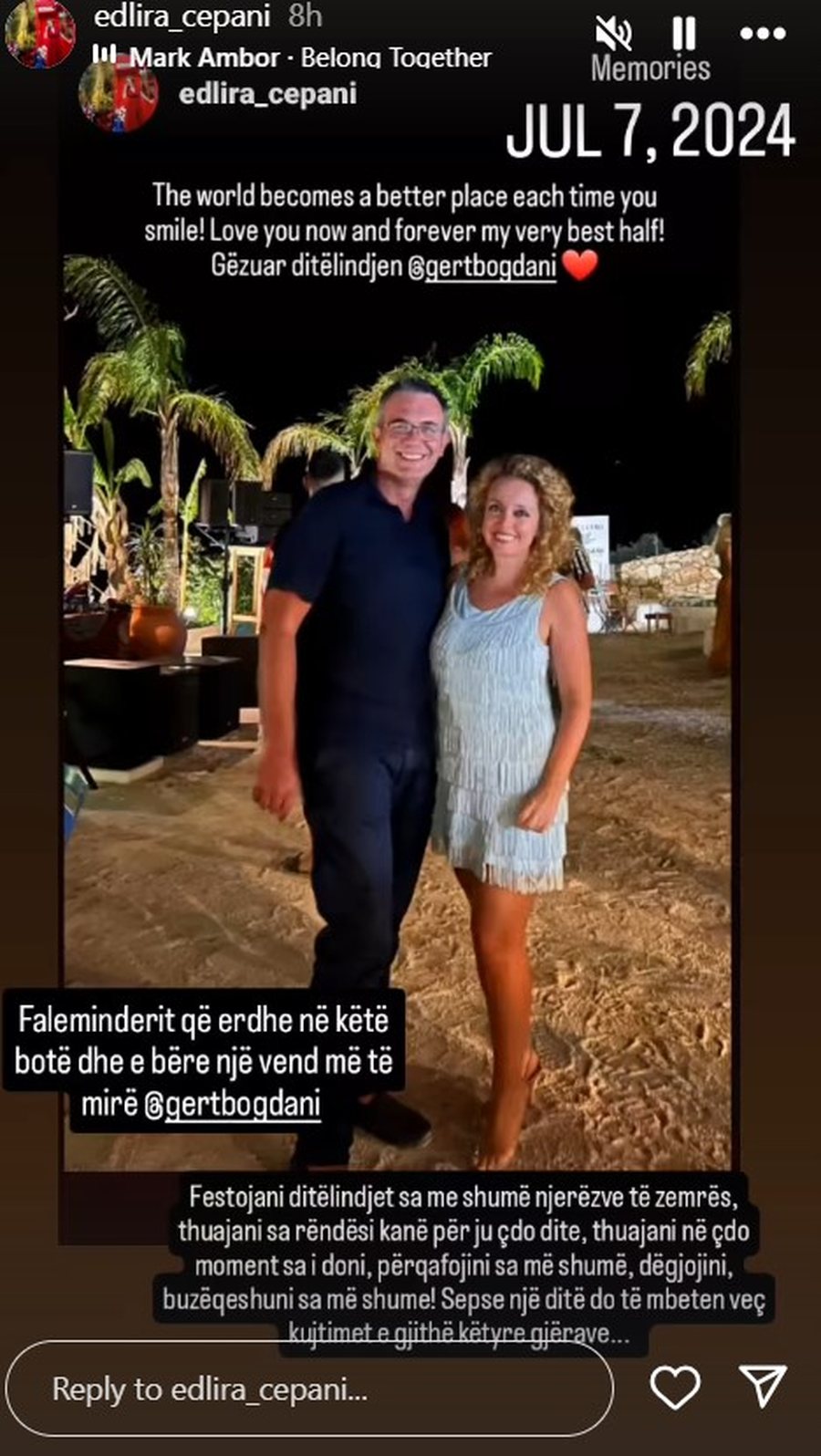 Politikani Gert Bogdani do të festonte sot ditëlindjen e tij te 45-të dhe në këtë ditë Edlira Çepani nuk mund të qëndronte pa shkruajtur disa rreshta për dashurinë e saj të jetës, babain e dy engjëjve të saj, shokun dhe njeriun ku shtrinte kokën kurdo herë dhe sa herë që ndihej e pambrojtur.
