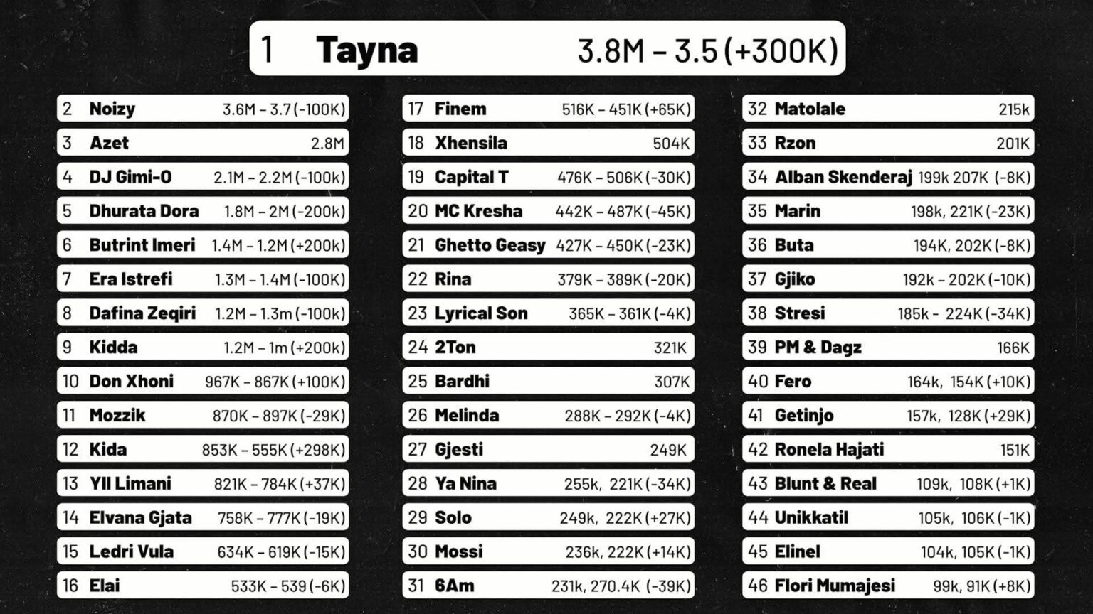 Tayna është shpallur zyrtarisht artistja më e dëgjuar dhe më e paguar shqiptare në Spotify për muajin gusht. Me 3.8 milion dëgjues mujor dhe një rritje të jashtëzakonshme prej +300 mijë dëgjuesish brenda vetëm një muaji. Renditja e publikuar e vendos atë në krye, duke lënë pas emra të njohur si Noizy, Azet, Dhurata Dora, Butrint Imeri e shumë të tjerë.