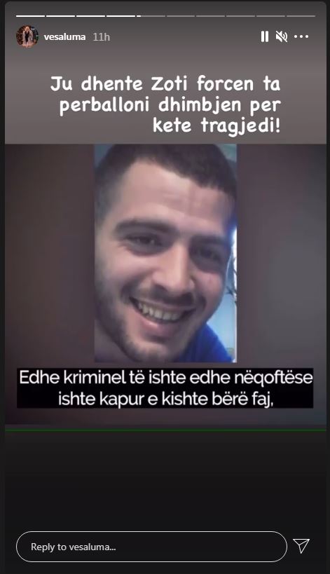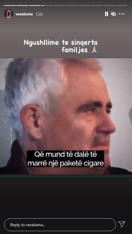Nëpërmjet disa Story në Instagramin e saj Vesa ka treguar se i është këputur shpirti nga deklarata e babait të Klodianit teksa i ka shprehur ngushëllimet familjarëve.