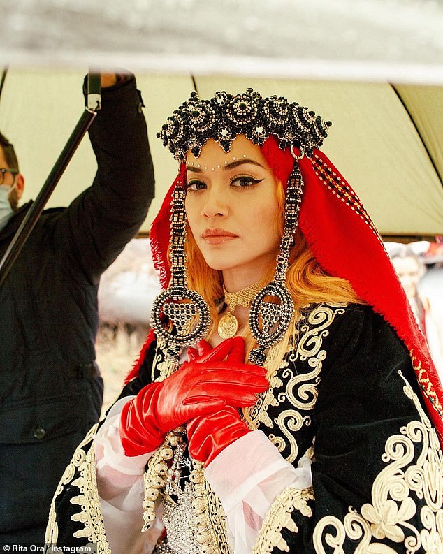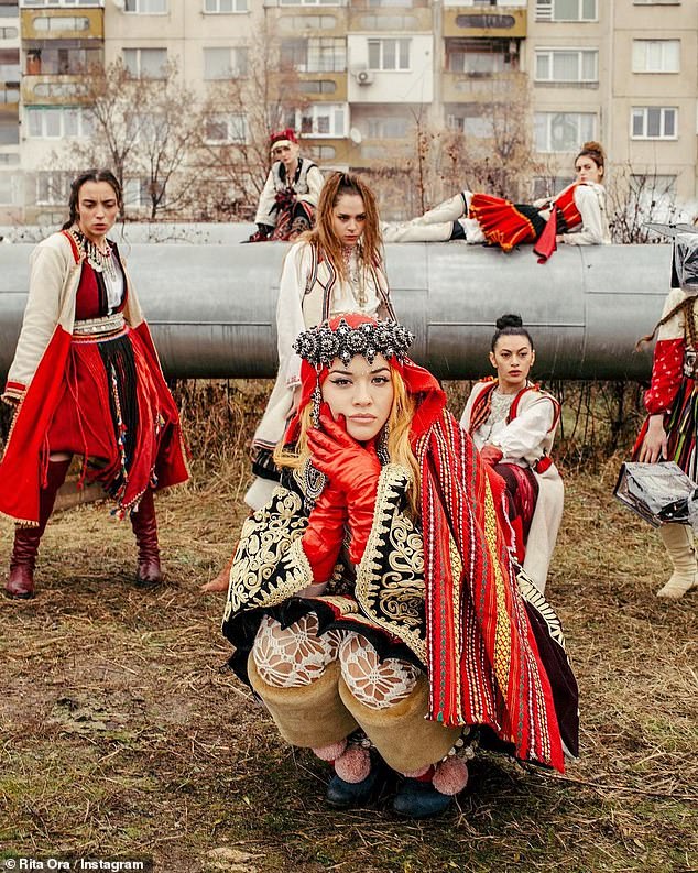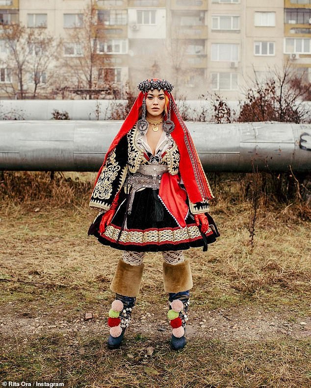 Rita gjithashtu kishte veshur çizme ngjyrë blu të errëta me detaje nga leshi artificial dhe doreza të kuqe të ndezura ndërsa pozonte së bashku me disa gra të tjera me veshje tradicionale.
