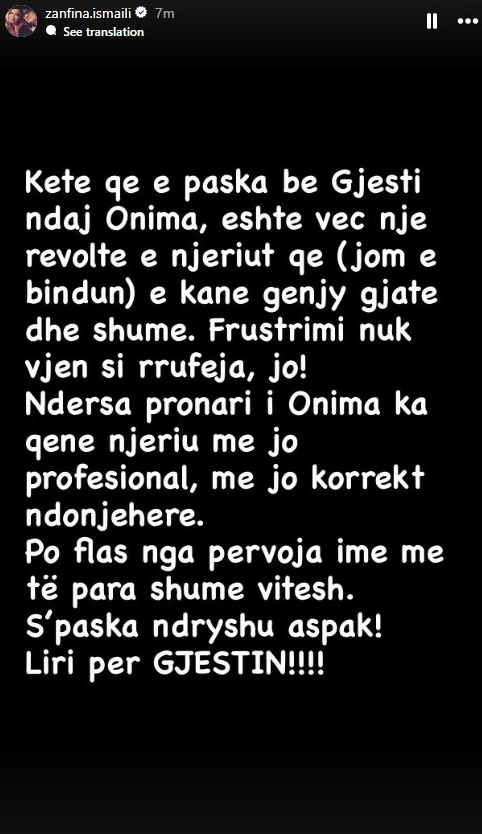“Këtë që e paska bërë Gjesti ndaj Onima, është veç një revoltë e njeriut që (jam e bindur) e kanë gënjyer gjatë dhe shumë. Frustrimi nuk vjen si rrufeja, jo! Ndërsa pronari i Onima ka qenë njeriu më jo profesional, më jo korrekt ndonjëherë. Po flas nga përvoja ime para shumë vitesh. S’paska ndryshuar aspak! Liri për Gjestin”, ka shkruar Zanfina në InstaStory. Gjesti po përballet me akuza nga Prokuroria Themelore në Prishtinë për tri vepra penale, ndërsa rasti është duke u trajtuar nga organet e drejtësisë.