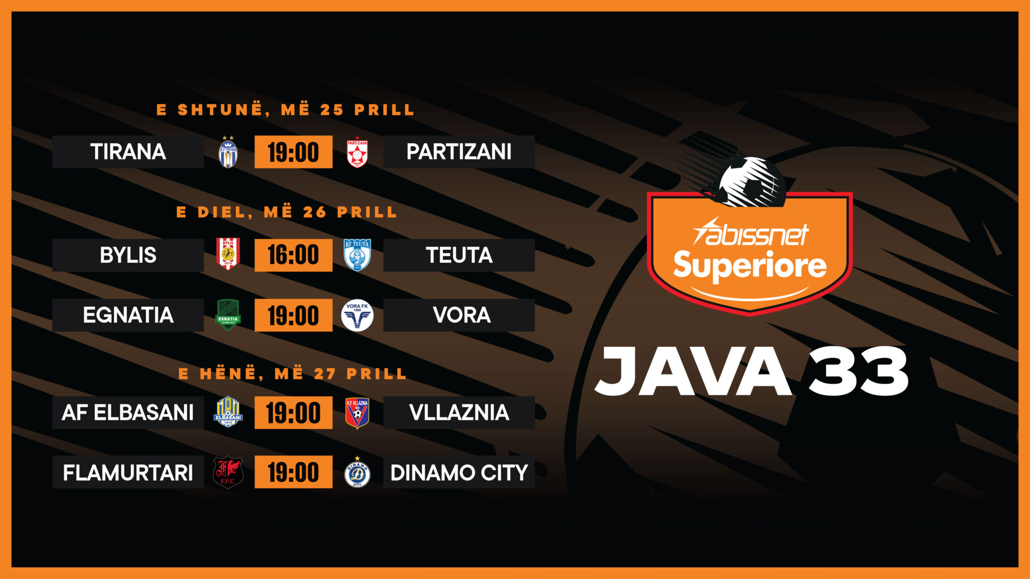 Java e 33-të e kampionatit “Abissnet Superiore” hapet me një nga përballjet më të shumëpritura të sezonit, derbin e fundit të kryeqytetit për këtë edicion mes Tiranës dhe Partizanit. Një sfidë me peshë të madhe për të dyja skuadrat, që synojnë maksimumin për të përmbushur objektivat e tyre në këtë fazë vendimtare të kampionatit. Takimi do të zhvillohet më 25 prill, në stadiumin “Air Albania”, duke nisur nga ora 19:00.