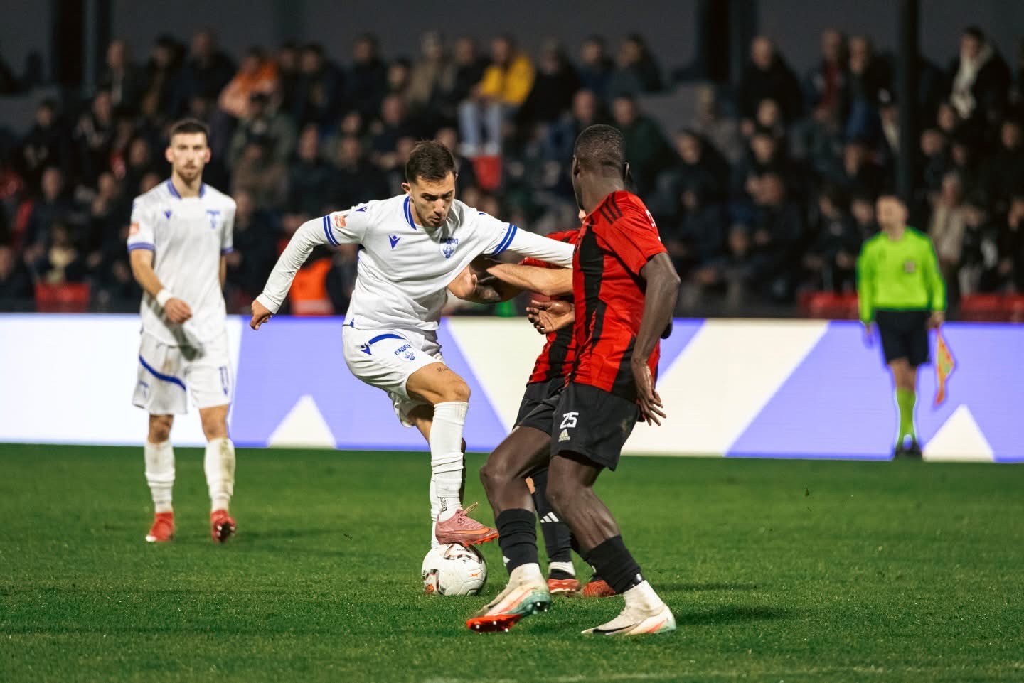 Muço Boçi i Teutës, Dejvi Bregu i Dinamo City dhe Lirim Kastrati i Vllaznisë mbështesin në sulm futbollistin e Bylisit, Ibrahim Mustapha.