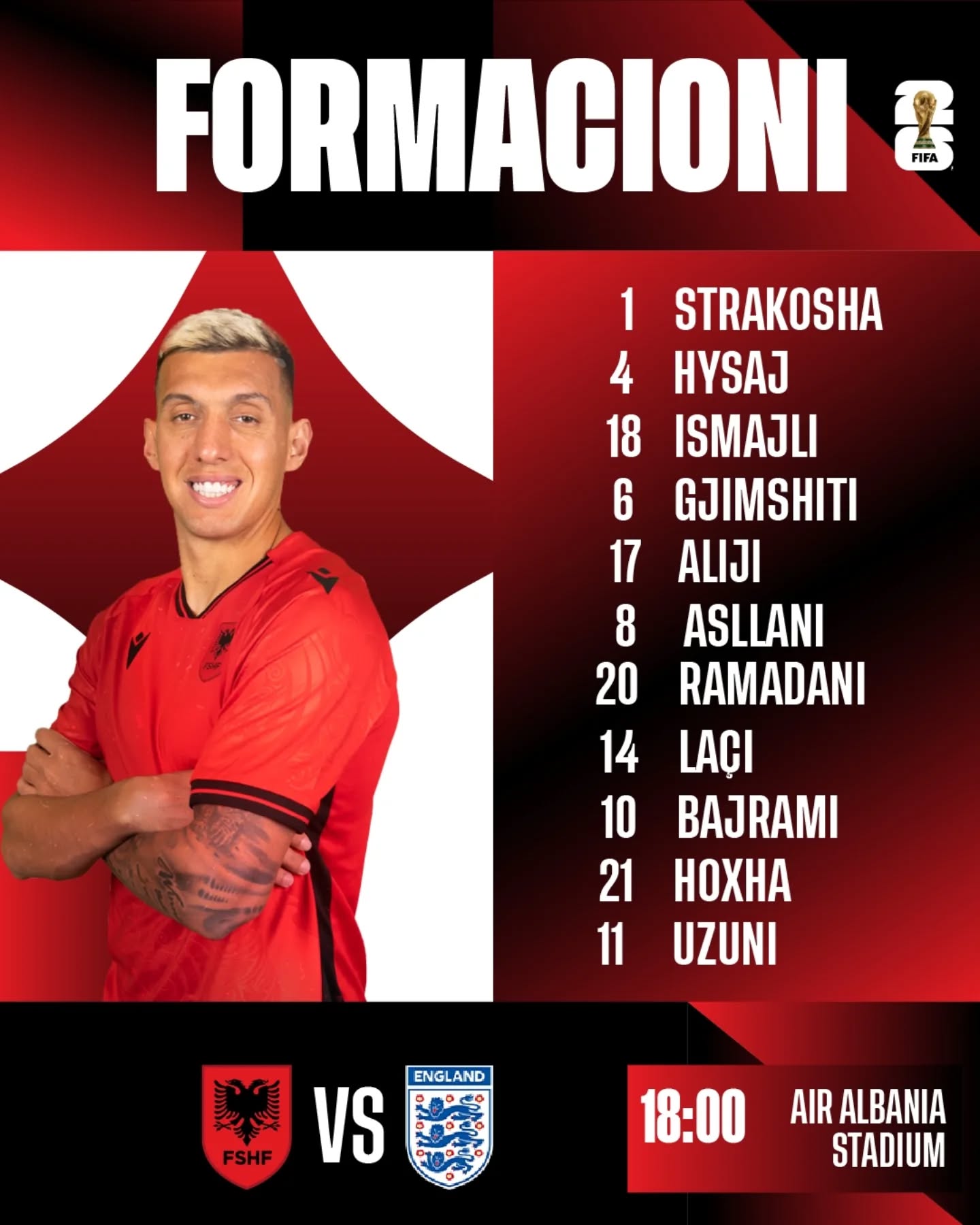 Shqipëria (4-3-3): Strakosha; Hysaj, Ismajli, Gjimshiti, Aliji; Asllani, Ramadani, Laçi; Hoxha, Bajrami, Uzuni.