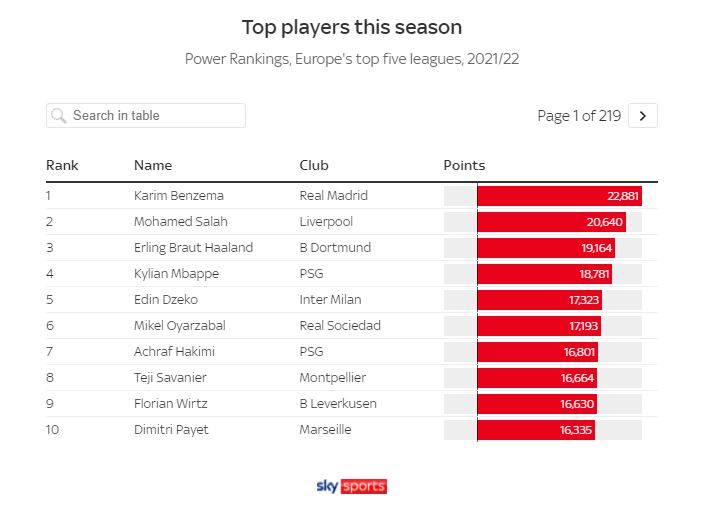 Karim Benzema është futbollisti më i mirë këtë sezon në Europë. Sulmuesi francez ka shënuar 10 gola në 10 ndeshje dhe asistuar edhe 7 herë për momentin është lojtari më i vlerësuar në botë me 22 mijë e 881 pikë në një renditje të Sky Sports.