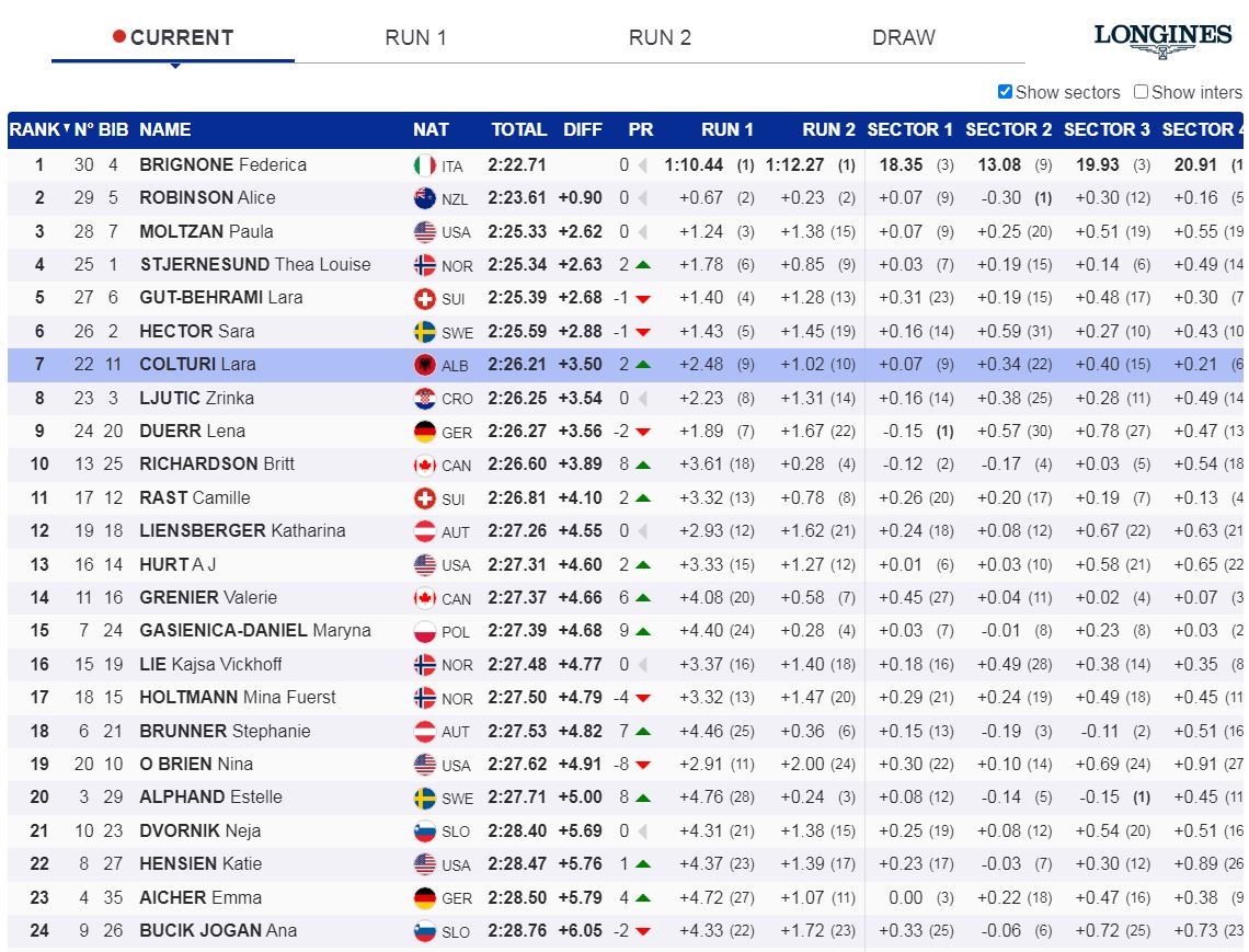 Skiatorja Lara Colturi është renditur e shtata në Kampionatin Botëror të Skive Alpine që po zhvillohet në Saalbach të Austrisë. Italo-shqiptarja garoi në disiplinën e Sllallomit Gjigant dhe e mbylli provën e parë në vendin e nëntë me kohën 1:12.92.