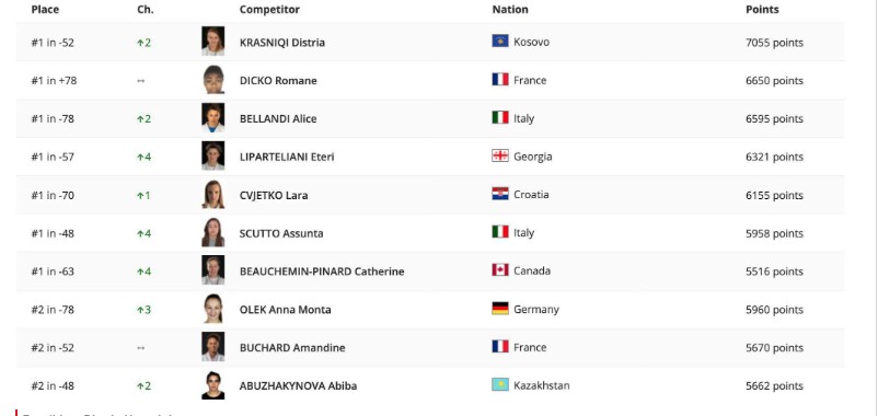 Më parë, kreun e renditjes në kategorinë deri në 52 kg e mbante francezja Amandine Buchard me 5700 pikë, por me pikët e fundit, Krasniqi ka marrë një epërsi bindëse, duke e shtyrë rivalen e saj në vendin e dytë.