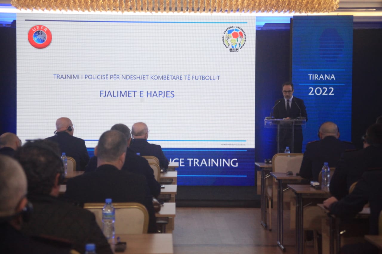 Trajnimi udhëhiqet nga lektorë të UEFA-s dhe përfaqësuesi i Rrjetit Policor për Shkëmbimin e Informacionit për Ndeshjet e Futbollit NFIP, Adrian Dinca.