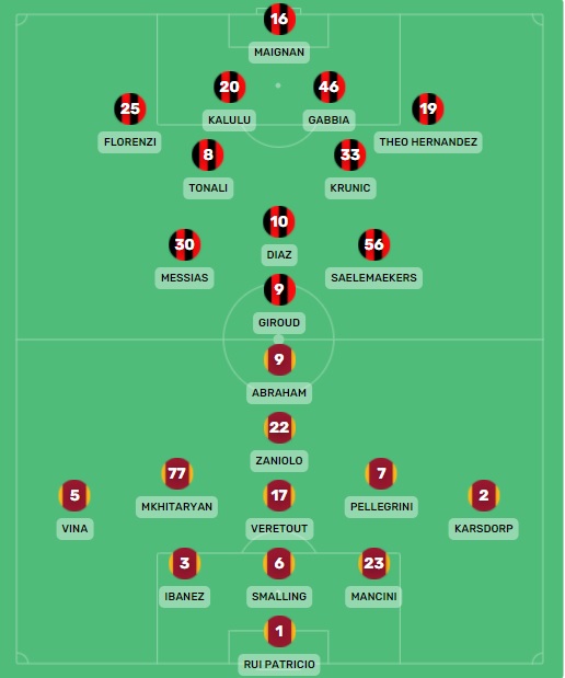 Milan dhe Roma kanë zbuluar formacionet me të cilat do të zbresin në fushë pas pak minutash, ku edhe spektakli është i garantuar. Kuqezinjtë në këtë duel do të mbështeten te Giroud në majën e sulmit, i mbështetur nga Messias, Saelemaekers dhe Brahim Diaz.