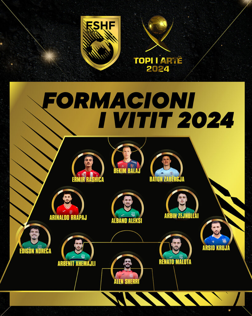Nga porta në sulm, 11 lojtarët të cilët kanë qenë vendimtarë me klubet e tyre përgjatë vitit 2024 janë këto: Alen Sherri (portier), Edison Ndreca (mbrojtës i majtë), Renato Malota (qendërmbrojtës), Arbenit Xhemajli (qendërmbrojtës), Arsid Kruja (mbrojtës i djathtë), Arinaldo Rrapaj (mesfushor i majtë), Albano Aleksi (mesfushor qendre), Arbin Zejnullai (mesfushor i djathtë), Ermir Rashica (sulmues i majtë), Bekim Balaj (sulmues qendre) dhe Baton Zabërgja (sulmues i djathtë). 11 futbollistët u ngjitën në skenë dhe tërhoqën çmimet, teksa nuk munguan falënderimet e rastit dhe një foto e të gjithë ekipit së bashku.