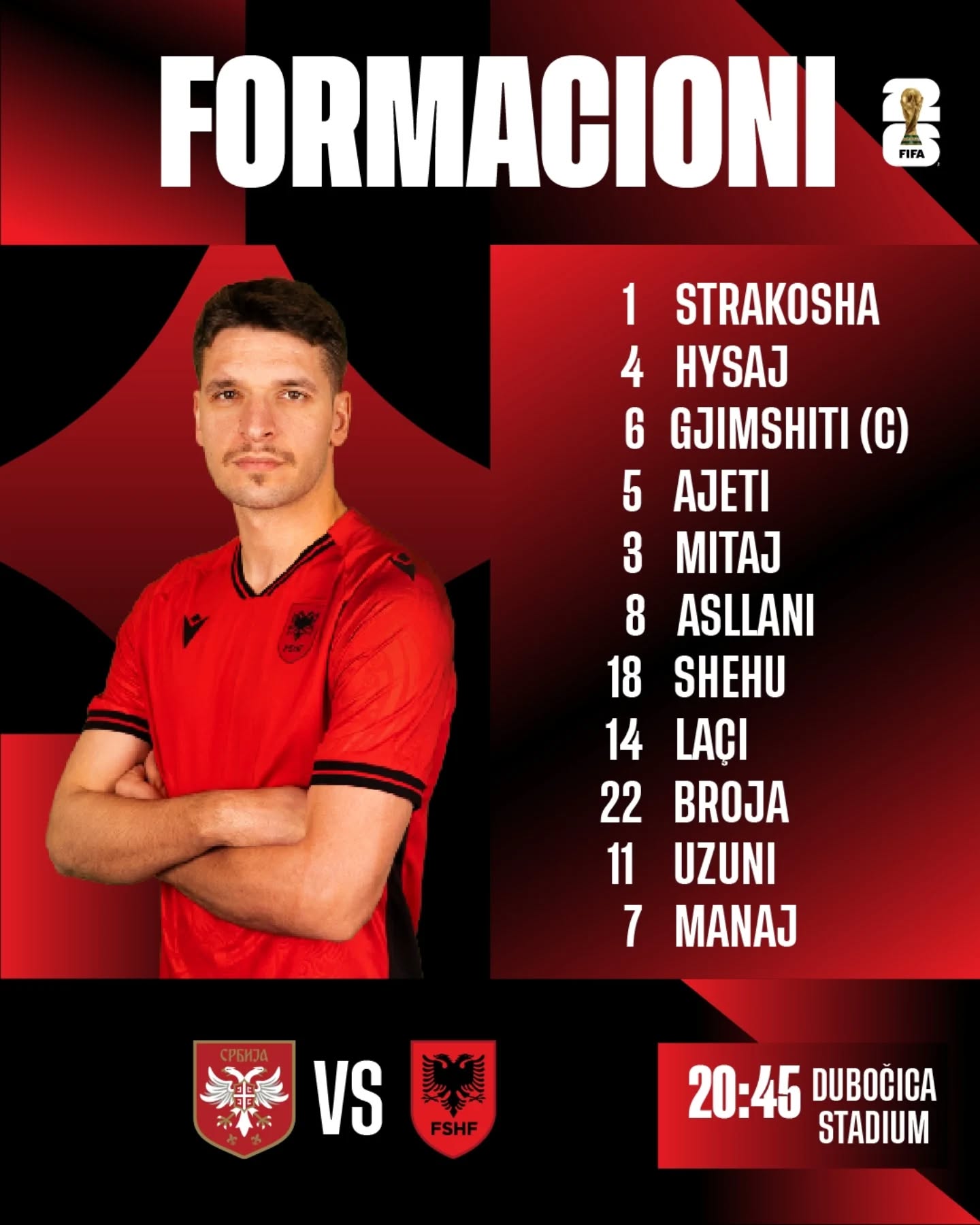 Vetëm pak orë na ndajnë nga sfida Serbi-Shqipëri në Leskovc, aty ku kuqezinjtë do të luajnë shanset e fundit për një vend në “Play Off” të Botërorit 2026. Federata Shqiptare e Futbollit ka publikuar edhe formacionin kuqezi. Në portë do të jetë Strakosha. Mbrojtja do të përbëhet nga Hysaj, ajeti, Gjimshiti dhe Mitaj.