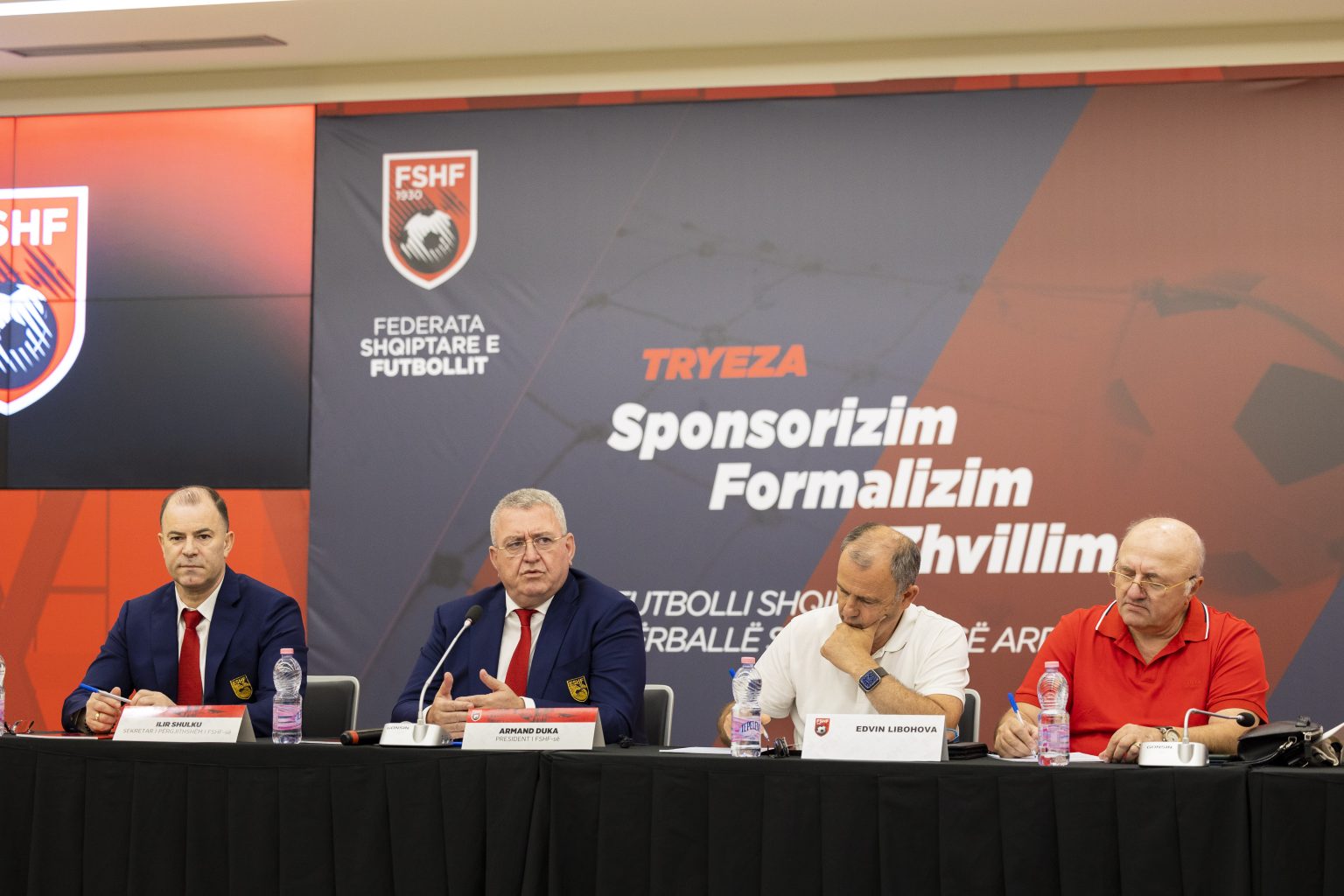 Federata Shqiptare e Futbollit organizoi sot një tryezë me temë “Sponsorizim/Formalizim/Zhvillim. Futbolli shqiptar përballë sfidave të së ardhmes”, ku morën pjesë Presidenti i FSHF-së, Armand Duka, Sekretari i Përgjithshëm, Ilir Shulku, Zv.Presidenti i FSHF-së, Arben Dervishaj, përfaqësues të Ligës Profesioniste të Futbollit, presidentët e klubeve të kategorisë “Abissnet Superiore” dhe ata të Kategorisë së Parë.