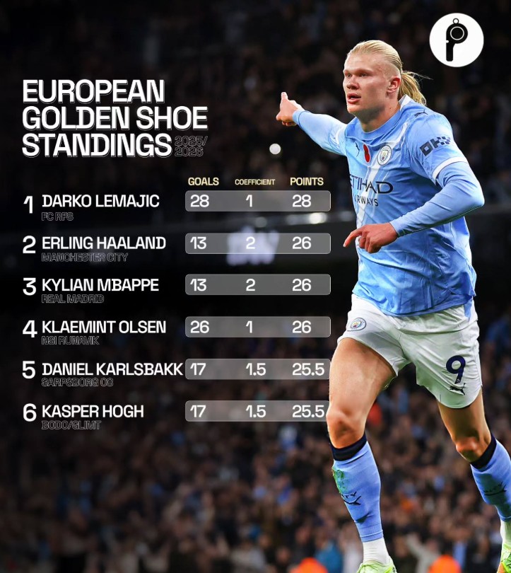 Megjithatë, lideri aktual i renditjes është një tjetër dhe vjen nga një kampionat krejtësisht jashtë qendrës së vëmendjes. Darko Lemajić, sulmues serb i klubit FC RFS në Letoni, ka shënuar plot 28 gola, duke grumbulluar më shumë se dyfishin e pikëve të yjeve si Haaland dhe Mbappé. Me këtë ritëm, ai është në rrugë të mirë për të befasuar Europën dhe për të fituar trofeun prestigjioz.