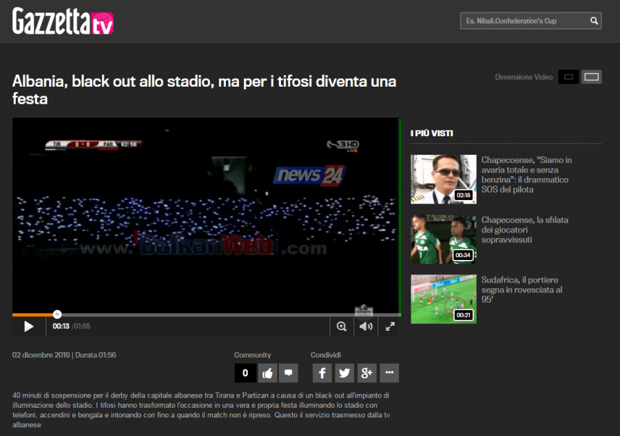 “40 minuta pritje or derbin e kryeqytetit shqiptar mes Tiranës dhe Partizanit për shkak të një ‘black-out’-i në impiantin e ndriçimit të stadiumit. Tifozët kanë përfituar nga erësira duke e kthyer stadiumin në një festë të vërtetë me dritat e smartphonave. Ndeshja është shtyrë dhe do të luhet sot në orën 14:00 për të mos pasur sërish probleme”,-shkruan La Gazzetta dello Sport.