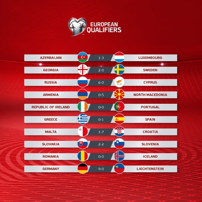 Spanja ka arritur një fitore shumë të rëndësishme 1-0 në transfertën e vështirë të Athinës kundër Greqisë. Golin e vetëm të ndeshjes e shënoi Sarabia në minutën e 26-të. Iberikët ju gëzuan edhe humbjes së Suedisë 2-0 në transfertën ndaj Gjeorgjisë duke marr kreun e Grupit B me 16 pikë, një më shumë se nordikët.