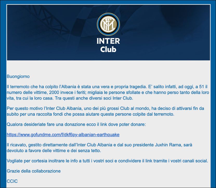 Per kete motiv Inter Club Albania, nje nga Inter Clubet me te medha ne bote ka vendosur qe te akivizohet qe ne momenti ne pare ne nje mbledhje fondesh qe mund te ndihmoje personat e prekur nga termeti.