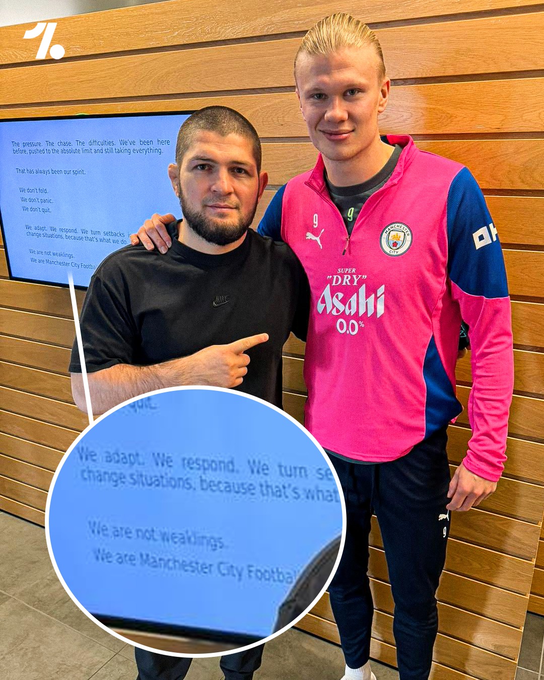 Në ditët e fundit, Haaland ka tërhequr vëmendje edhe jashtë fushës, pas takimit me ish-kampionin e MMA-së, Khabib Nurmagomedov, i cili vizitoi qendrën stërvitore të City-t. Një foto e publikuar në rrjetet sociale me përshkrimin “Mentalitet” zbuloi pa dashje një nga motot motivuese të skuadrës, të vendosur në hyrje të dhomave të zhveshjes: një mesazh që përmbledh shpirtin luftarak dhe ambicien e Manchester City-t.
