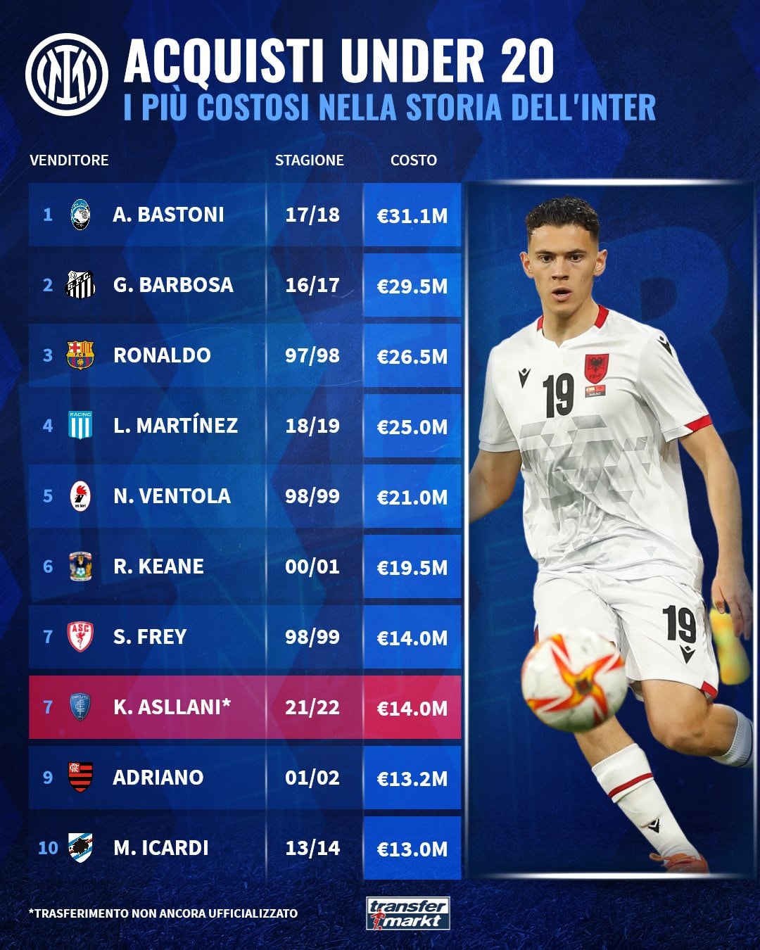 Interi beson te Asllani, ka kushtuar më shumë se Icardi dhe Adriano