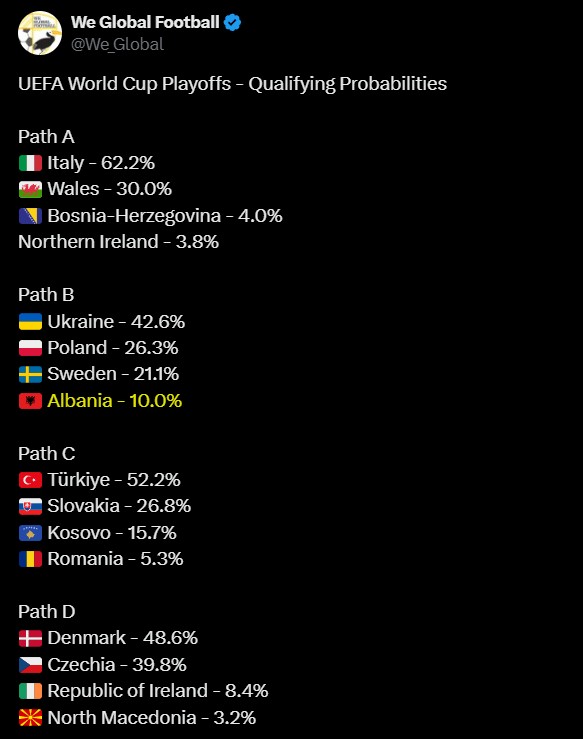 Së fundmi janë publikuar përqindjet zyrtare të probabilitetit të play-off-it drejt Botërorit 2026. Sytë e futbollit shqiptar janë të përqendruar te Zonën B, ku ndodhet edhe Shqipëria, një nga katër skuadrat që garojnë për një biletë unike drejt SHBA-Meksikë-Kanada 2026.