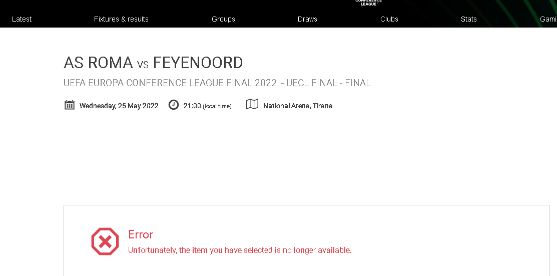 Një kaos i vërtetë po ndodhë në orët e fundit pasi është hapur shitja e biletave Online nga UEFA për finalen e Conference League mes Romës dhe Feyenoordit. Të shumtë kanë qenë tifozët që kanë nxituar që të futen në faqen e UEFA-s për të kërkuar një biletë, por nuk kanë mundur që ta gjejnë.