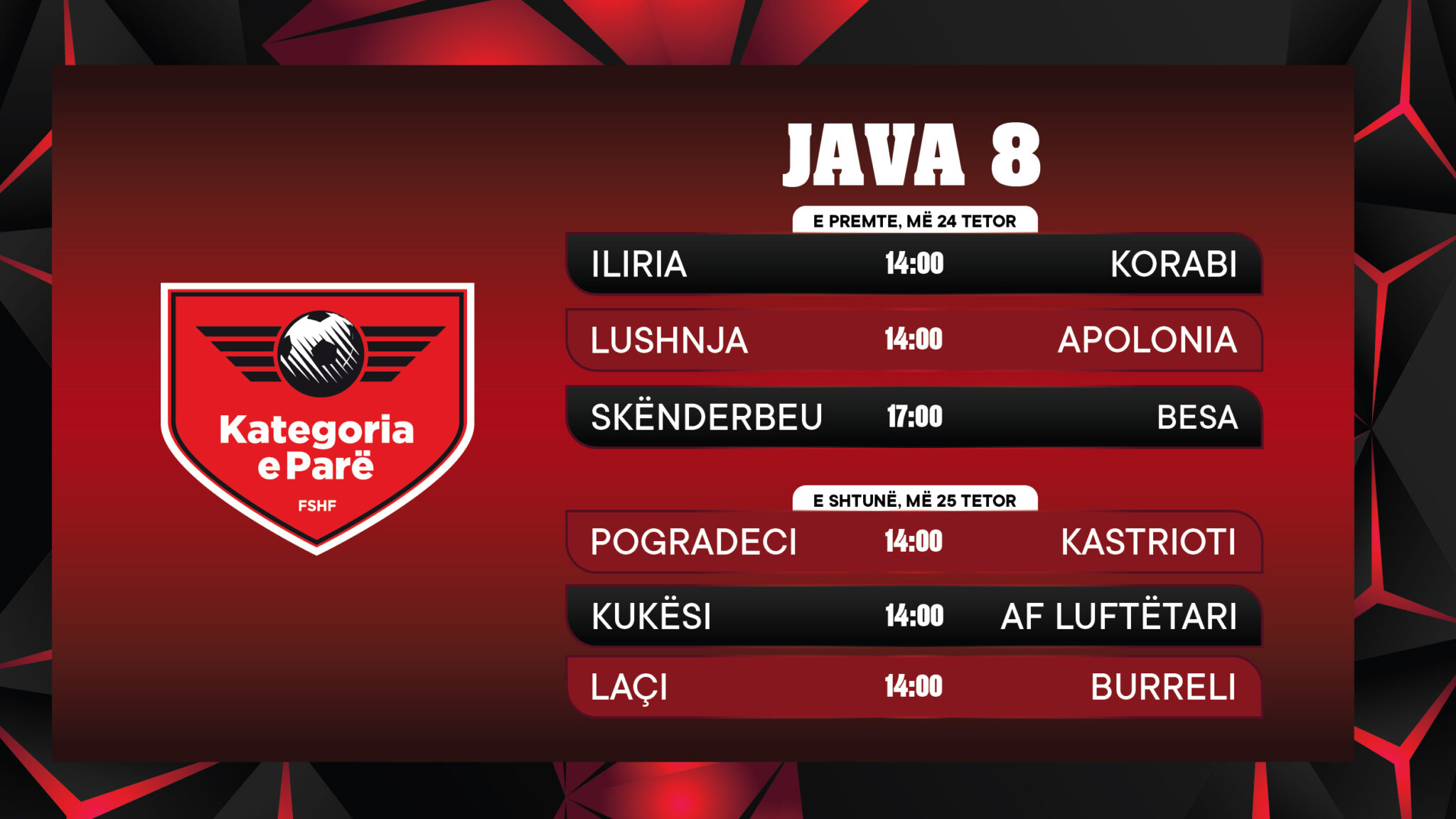 Java e 8-të e Kategorisë së Parë do të luhet të premten dhe të shtunën.