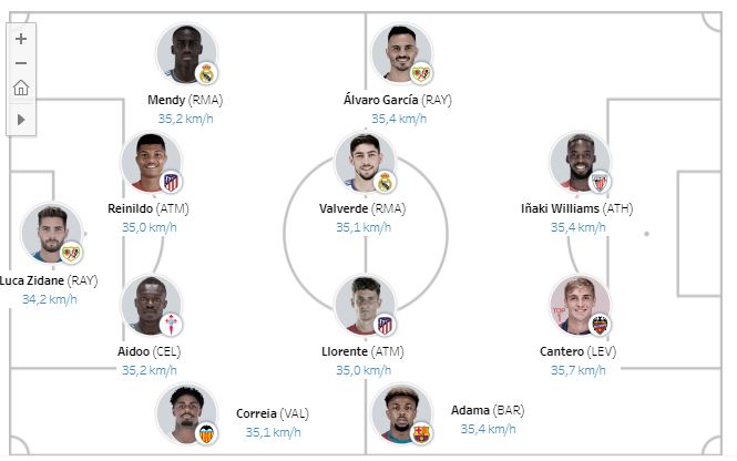 Kampionati spanolll ka futbollist shumë të shpejtë, teksa në krye qëndron Nico Williams i Bilbaos me 35.33 km/h, i ndjekur nga shumë pranë nga Luis Suarez i Granada-s me 35.22 km/h. Sobrino, Vinicius Junior, Sorloth dhe Boulaye Dia janë arrijnë gjithashtu shpejtësinë 35 km/h.