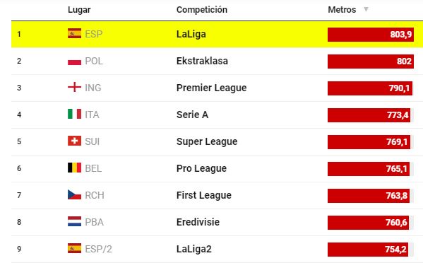 Një studim i fundit i kryer nga observatori evropian i futbollit CIES, ka evidentuar se La Liga është kampionati me intesitetin më të lart të lojës. Nëse matet distanca mesatare e përshkruar në sprint, kampionati zviceran zë vendin e dytë.