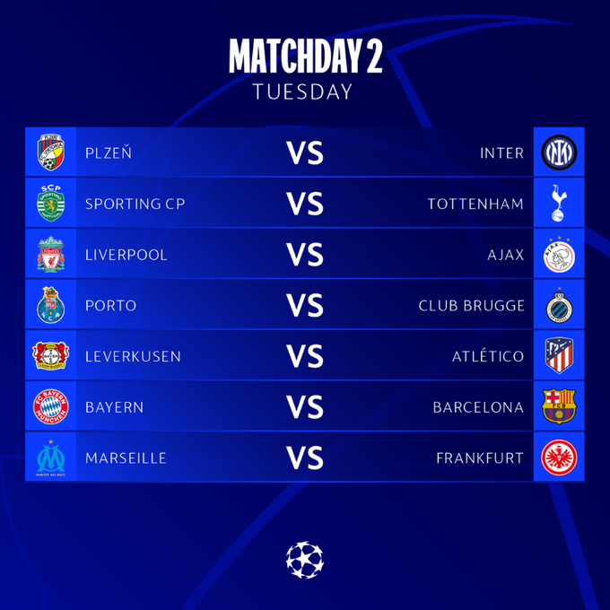 Champions League rikthehet sonte në mbrëmje me ndeshjet e dyta të fazës së grupeve. Emocionet nisin në orën 18:45, teksa Interi do të luajë në transfertën ndaj Viktoria Plzen. Skuadra zikaltër do të kërkojë 3 pikët e para në këë edicion. Në të njëjtën orë nuk pritet ta ketë të thjeshtë as Tottenhami që do të luajë në transfertën ndaj Sporting Lisbonë.