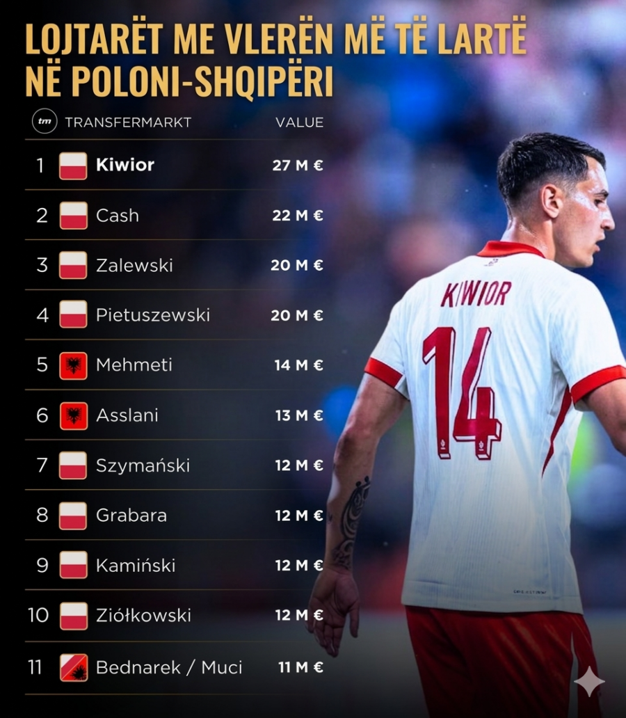 Lista mbyllet me Ernest Muçi, një nga talentet më premtuese të futbollit shqiptar, i cili vlerësohet me 11 milionë euro dhe konsiderohet si një investim për të ardhmen. Polonia vjen me lojtarë që luajnë në nivele të larta evropiane, ndërsa Shqipëria vazhdon të ndërtojë dhe eksportojë talente në rritje. Megjithatë, historia e futbollit ka treguar shpesh se vlera në treg nuk përkthehet gjithmonë në sukses në fushë.