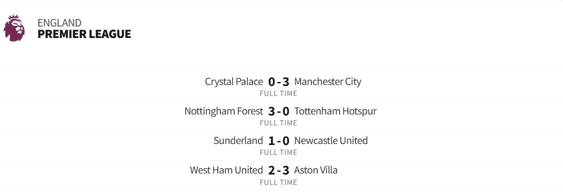 Në takimet e tjera të ditës, Nottingham Forest dhuroi surprizën duke mposhtur Tottenhamin 3-0. Protagonist ishte Callum Hudson-Odoi me dy gola, ku njëri prej tyre ishte mjaft spektakolar, ndërsa rezultatin e vulosi Ibrahim Sangaré. Sunderland festoi një fitore minimale 1-0 ndaj Neëcastle në shtëpi. Vendimtar rezultoi një autogol me kokë i Nico Ëoltemade në fillimin e pjesës së dytë.