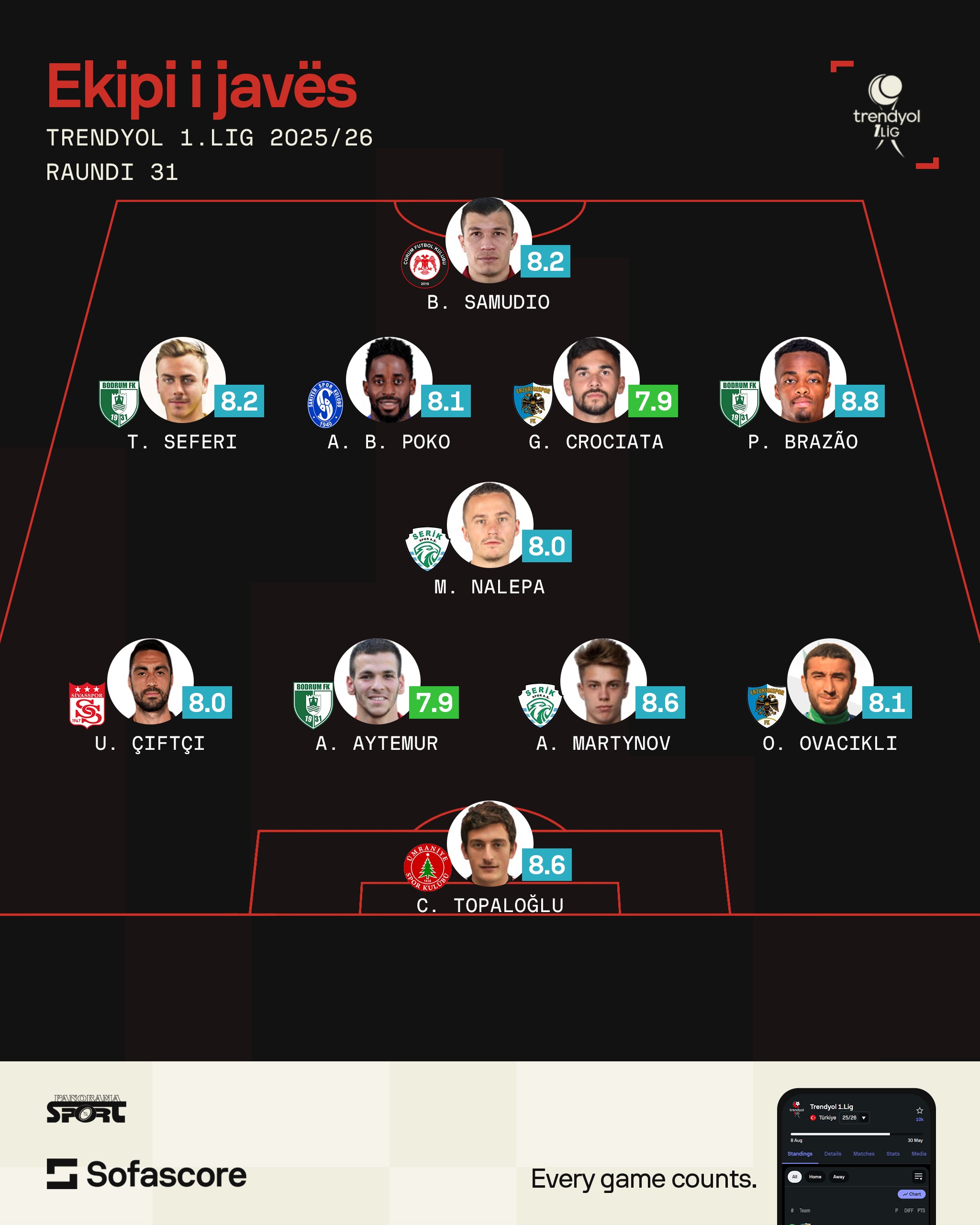 Seferi ishte protagonist edhe në javën e 31-të ku dhuroi një asist. Sulmuesi i Bodrumspor u përfshi nga “SofaScore” edhe në formacionin më të mirë të javës në Kategorinë e Parë në Turqi.
