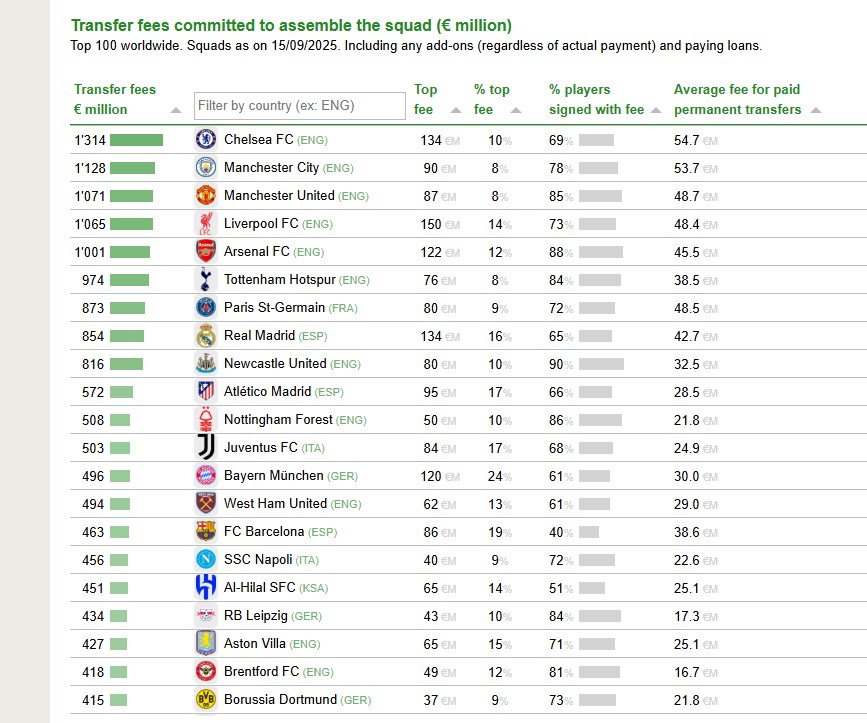 CIES Football Observatory ka publikuar listën e 100 klubeve në botë që kanë investuar më shumë në kartonët e lojtarëve për të ndërtuar skuadrat aktuale të tyre, duke përfshirë edhe bonuset e mundshme të marrëveshjeve. Në krye të renditjes qëndron Chelsea, me një total prej 1,314 miliardë eurosh, ku më i shtrenjti ka qenë Moisés Caicedo (134 milionë euro, 10% e shpenzimit total).