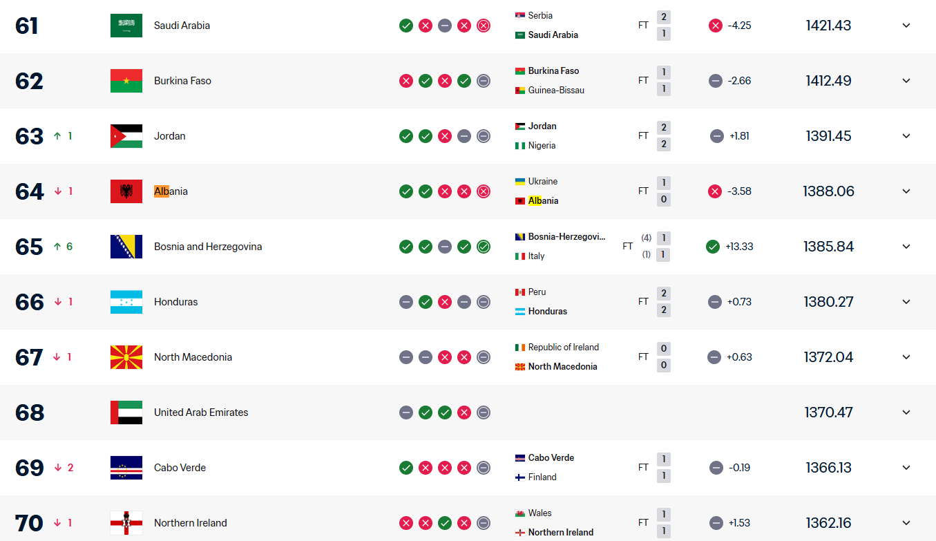 Në anën tjetër, Kosova ka bërë një hap pozitiv, duke u ngjitur me një vend dhe duke u pozicionuar tashmë në vendin e 78-të. “Dardanët” vazhdojnë të tregojnë progres gradual në arenën ndërkombëtare, duke përfituar nga paraqitjet solide në ndeshjet e fundit.