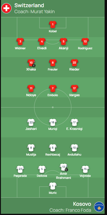 Kosova luan në transfertë ndeshjen e parë kualifikuese për Botërorin 2026, ku në Bazel do të ndeshet me Zvicrën. Edhe pse një sfidë e vështirë në letër, “Dardanët” do të tentojnë të surprizojnë ekipin zviceran, me Granit Xhakën kapiten. Trajneri Franco Foda ka hedhur në fushë 11-shen e tij, që rreshtohet në formacionin 4-3-3.