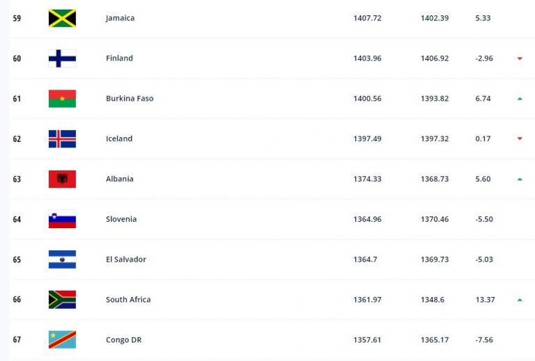 Me 1374.33 pikë, 5.6 pikë më shumë se muajin e kaluar kuqezinjtë lënë pas në renditje Slloveninë, El Salvadorin dhe Afrikën e Jugut, ndërsa përpara Shqipërisë qëndrojnë Finlanda, Burkina Faso dhe Islanda që është në rënie të lirë.