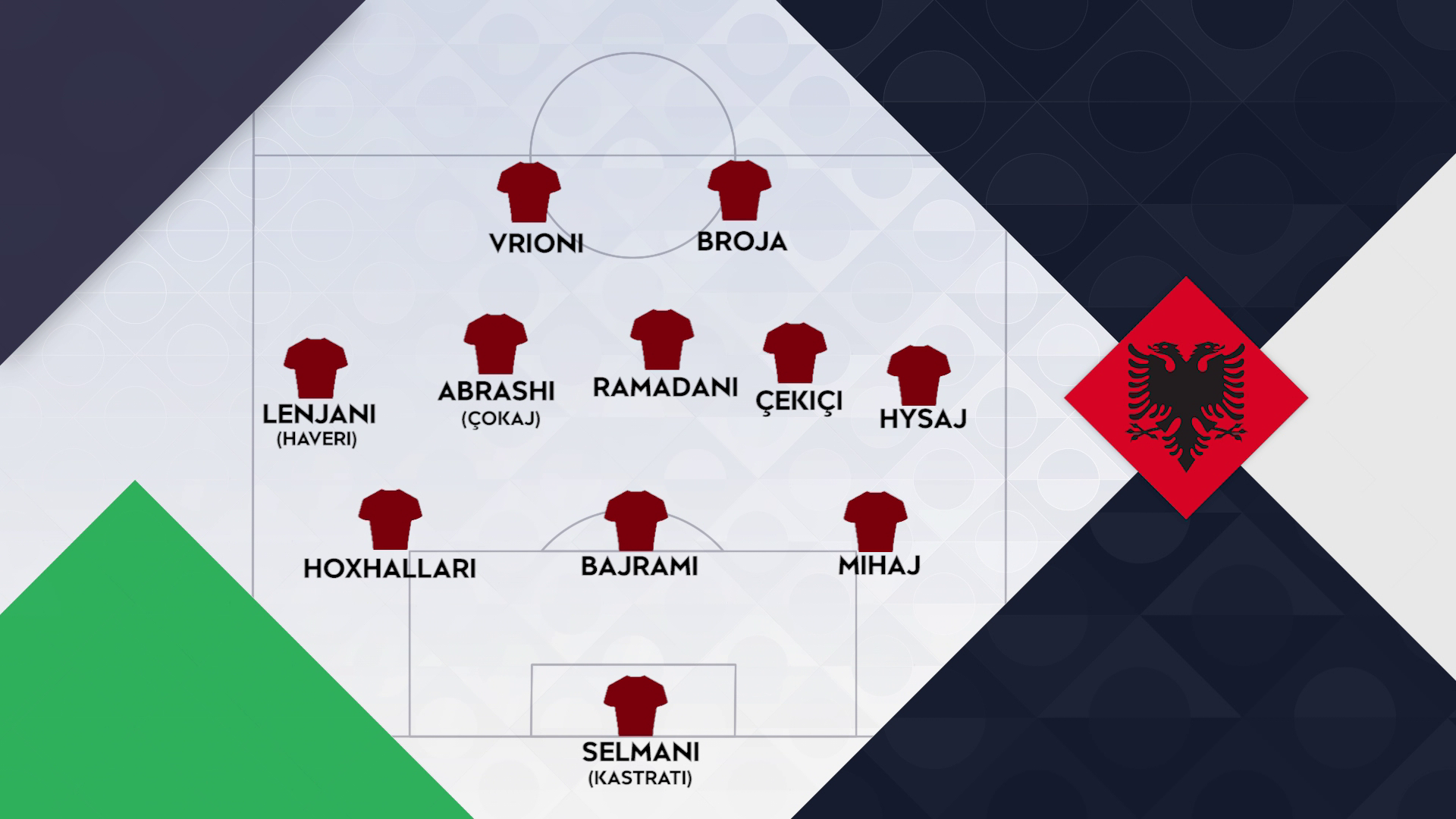 Formacioni – Skema mbetet e njëjta 3-5-2, por me shumë ndryshime në lojtarë. Selmani do të mbrojë portën, ndërkohë që në mbrojtje para tij do rreshtohen Hoxhollari, Bajrami dhe Mihaj. Hysaj dhe Lenjani pritet të luajnë nga krahët, ndërkohë që në mesfushë Abrashi mund të mbetet në fushë i mbështetur nga Çekiçi dhe Ramadani. Dyshja e sulmit do të jetë Vrioni dhe Broja.