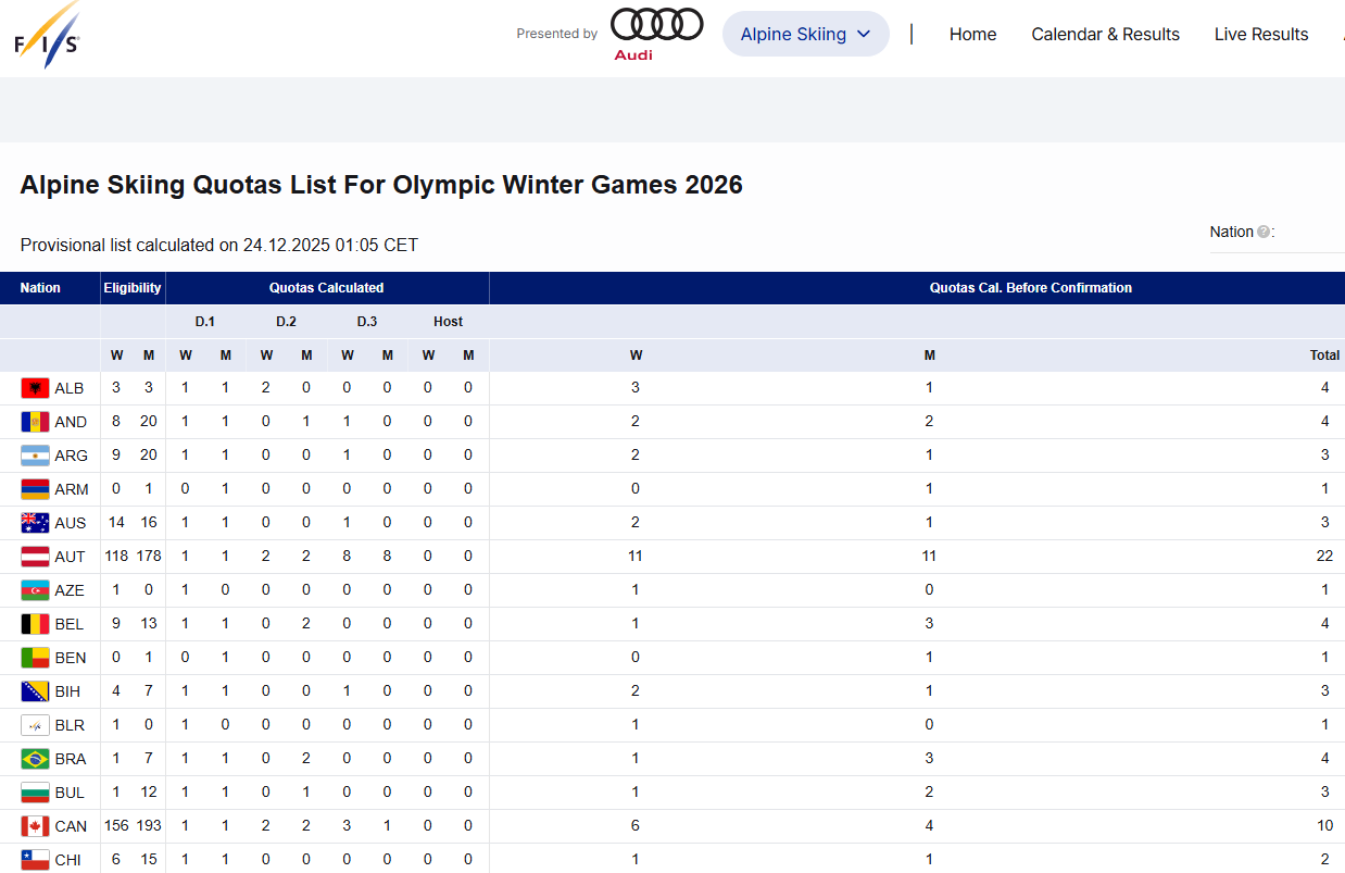 Shqipëria falë Lara Colturit ka shtuar pjesëmarrjen me dy skiatore në Lojërat Olimpike Dimërore që do të mbahen në Cortina të Milanos nga 6 deri më 22 shkurt 2026. Edhe pse në total janë 16 disiplina, 1 më shumë se Kinë 2022, Shqipëria do të përfaqësohet vetëm në skitë alpine.