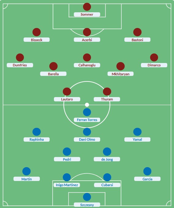 Këtë herë, tridenti nuk është më Messi-Neymar-Suarez, por Yamal-Raphinha-Ferran Torres, me Leëandoëskin, Baldén dhe Ter Stegen ende jashtë. Në portë do të luajë sërish Szczesny, ndërsa në mbrojtje Flick po mendon mes dysheve Martinez-Cubarsí ose Araujo me zhvendosje të Garcia-s në të majtë.