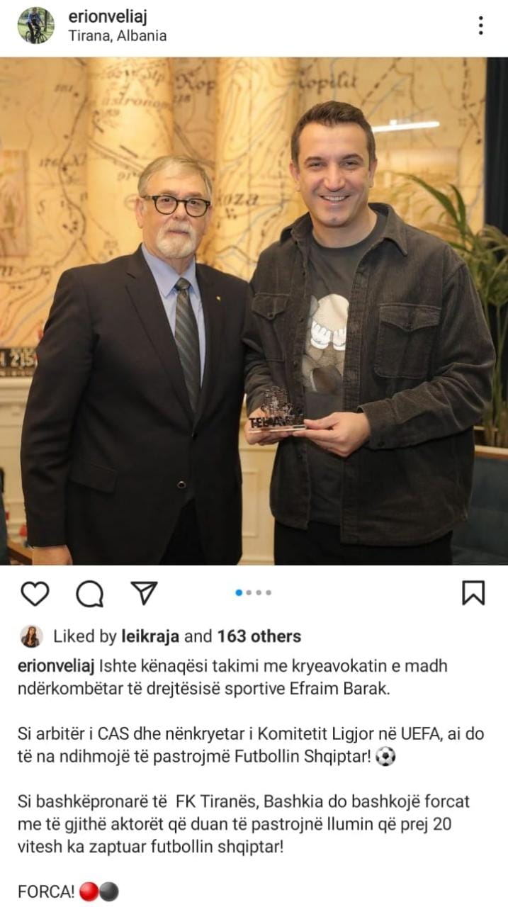 Avokati i njohur i të drejtësisë ndërkombëtare sportive Efraim Barak ka mohuar të ketë ardhur në Tiranë me ftesë të kryebashkiakut Erion Veliaj. Në një postim në rrjetet sociale Veliaj publikoi një foto me avokatin Barak dhe shkroi: “Ishte kënaqësi takimi me kryeavokatin e madh ndërkombëtar të drejtësisë sportive Efraim Barak. Si arbitër i CAS dhe nënkryetar i Komitetit Ligjor në UEFA, ai do të na ndihmojë të pastrojmë futbollin shqiptar! Si bashkëpronarë të FK Tiranës, Bashkia do bashkojë forcat me të gjithë aktorët që duan të pastrojnë llumin që prej 20 vitesh ka zaptuar futbollin shqiptar!”. Pra, sipas tij avokati Barak kishte ardhur në Tiranë për çështjen e futbollit.