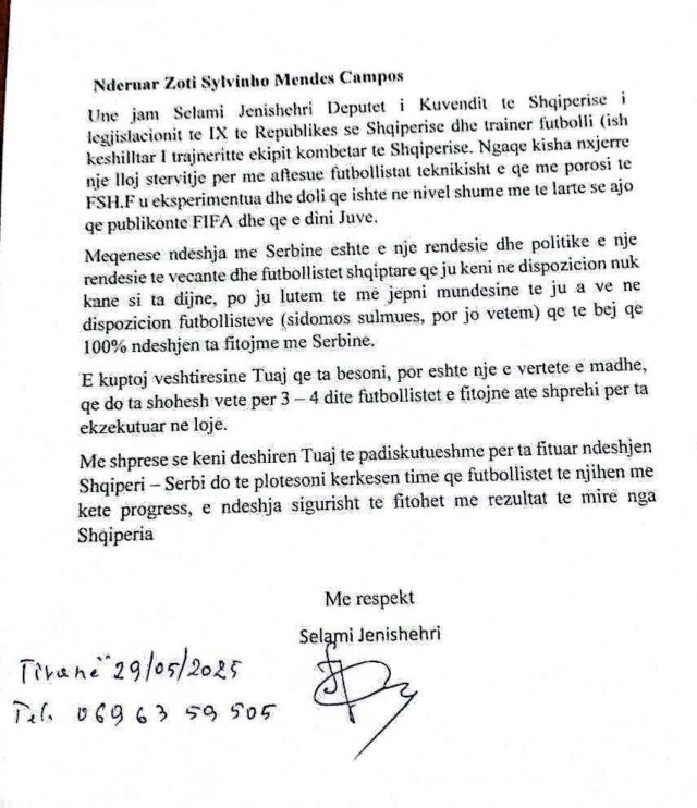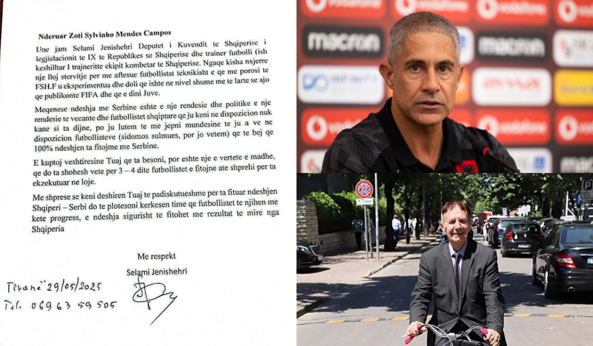 Përmes një letre publike, Jenisheri i kërkon teknikut brazilian që t’i japë mundësinë të punojë me lojtarët kuqezi përpara sfidës së rëndësishme ndaj Serbisë, duke pretenduar se zotëron një metodë stërvitore “shumë më të avancuar” sesa ajo e miratuar nga FIFA, madje, sipas tij, më e lartë se edhe njohuritë teknike të vetë Sylvinhos.