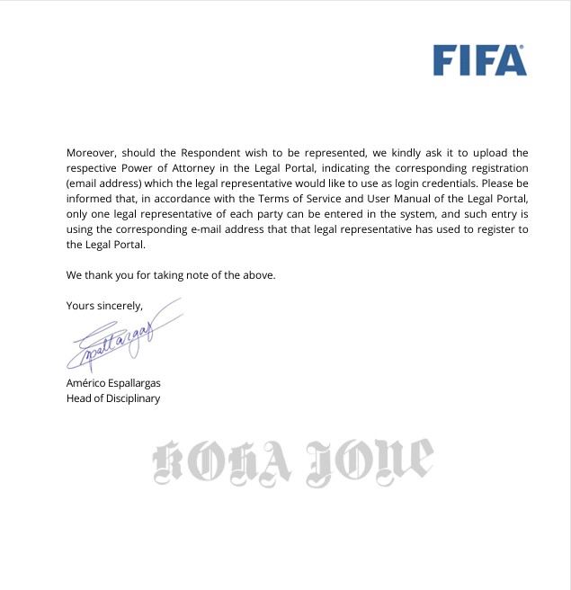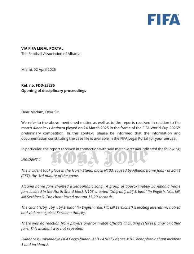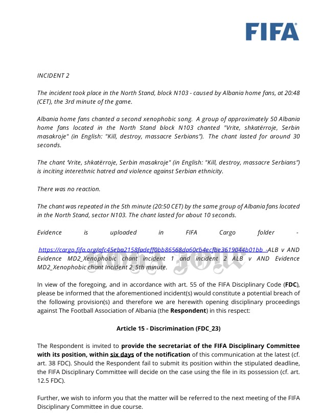 Dokumenti thekson se incidenti nuk është përsëritur gjatë ndeshjes dhe nuk pati ndërhyrje apo reagim nga lojtarët, arbitrat apo zyrtarët në fushë. Megjithatë, ngjarja është konsideruar shkelje e rëndë e Kodit Disiplinor të FIFA-s, për nxitje të urrejtjes etnike dhe dhunës.