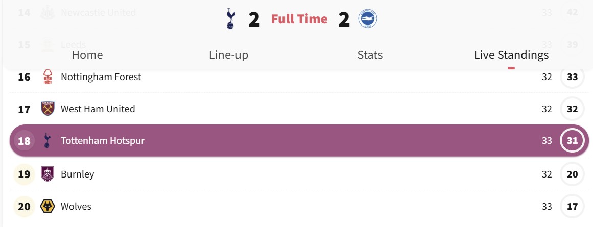 Pas këtij rezultati, Tottenham mbetet në zonën e rrezikut me 31 pikë në vendin e 18-të, ndërsa Brighton ngjitet në kuotën e 47 pikëve, duke u renditur në vendin e nëntë të klasifikimit.