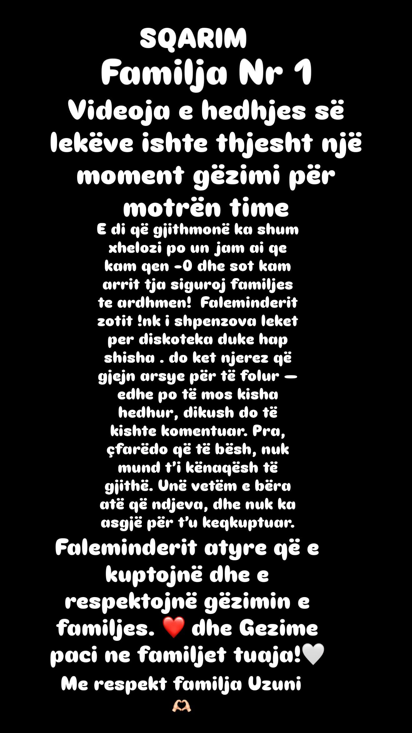 Përmes një mesazhi të gjatë në Instagram, Uzuni ka sqaruar se gjithçka ishte një moment gëzimi i sinqertë në rrethin familjar. Ai theksoi se gjesti nuk duhet parë me keqdashje, pasi për të dhe familjen kishte një kuptim emocional.